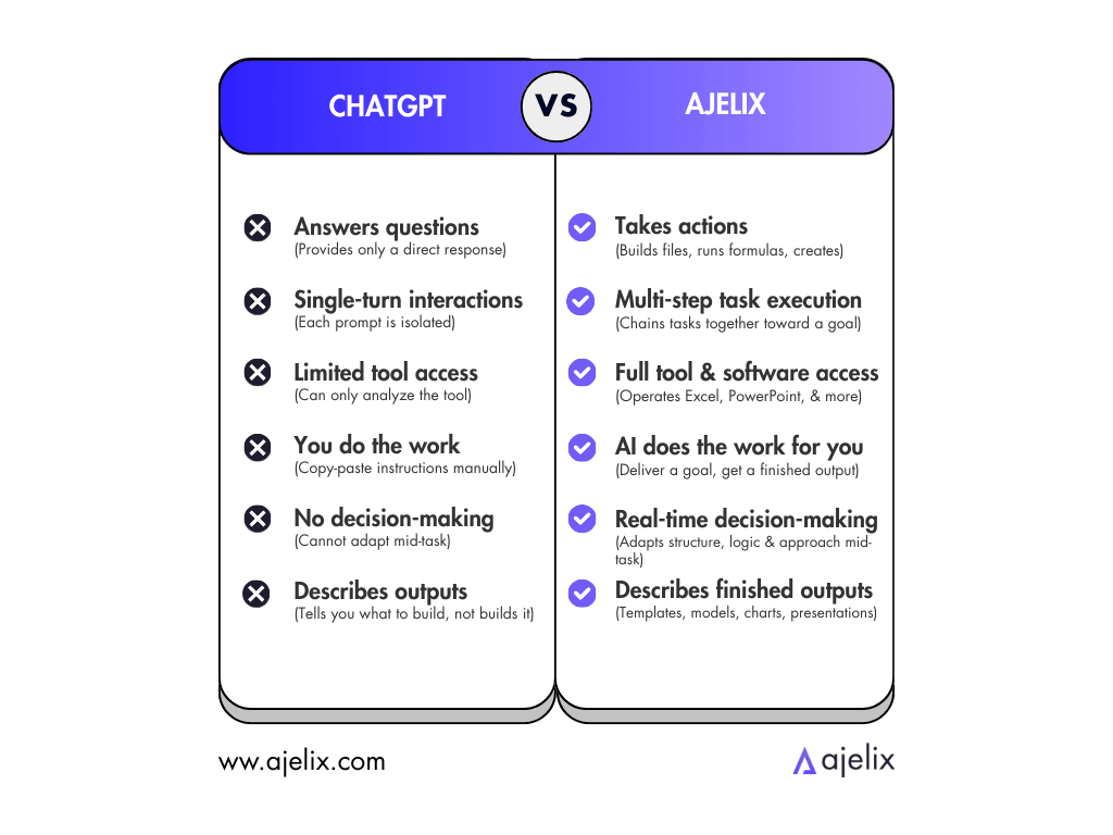 ChatGPT is a generative AI – it responds to your prompts with text, suggestions, or basic file outputs. Agentic AI, like Ajelix, takes actions on your behalf. It builds files, runs tasks, and delivers a finished output from a single prompt – instead of telling you how to do it yourself.