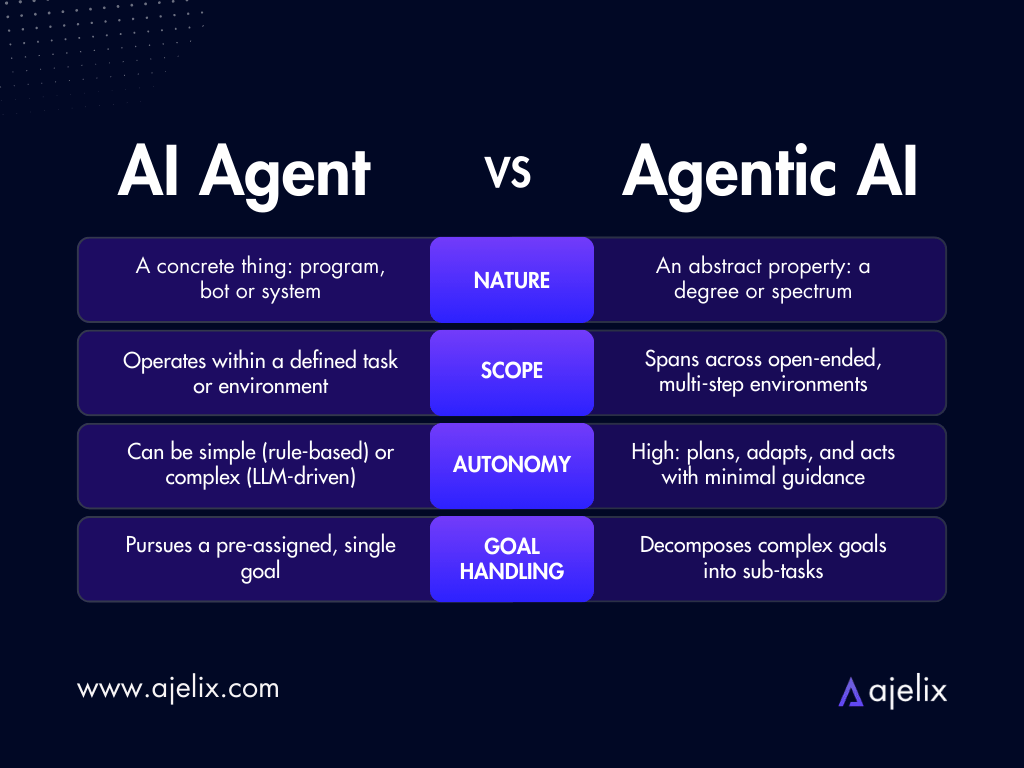 An AI agent is a concrete system – a program, bot, or software – designed to take actions toward a goal. Agentic AI is the property that makes an agent autonomous. Think of agentic AI as an adjective: it describes the quality of an AI agent that can plan, adapt, and act with minimal human guidance.