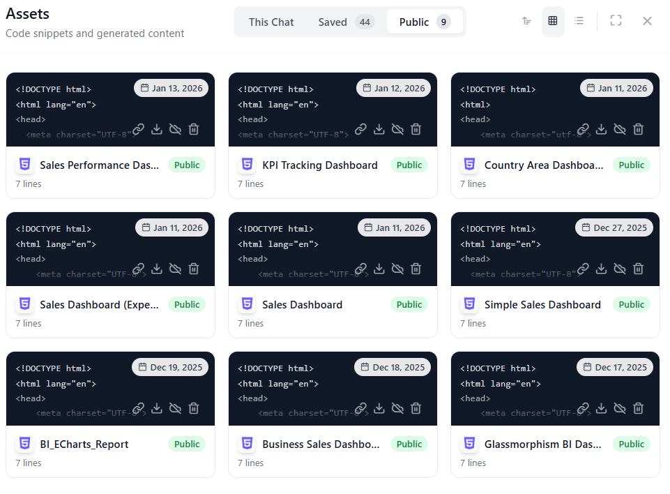 - Publish: Click “Publish” on any asset to generate a shareable link