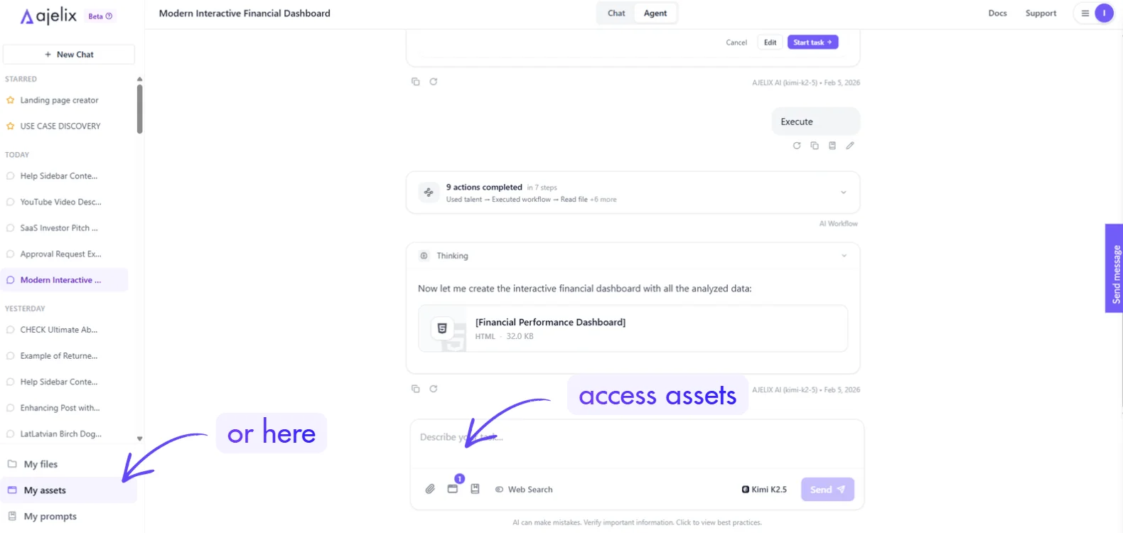 Assets are self-contained visual outputs generated by Ajelix that render directly in the chat. You can access them anytime in the interface: