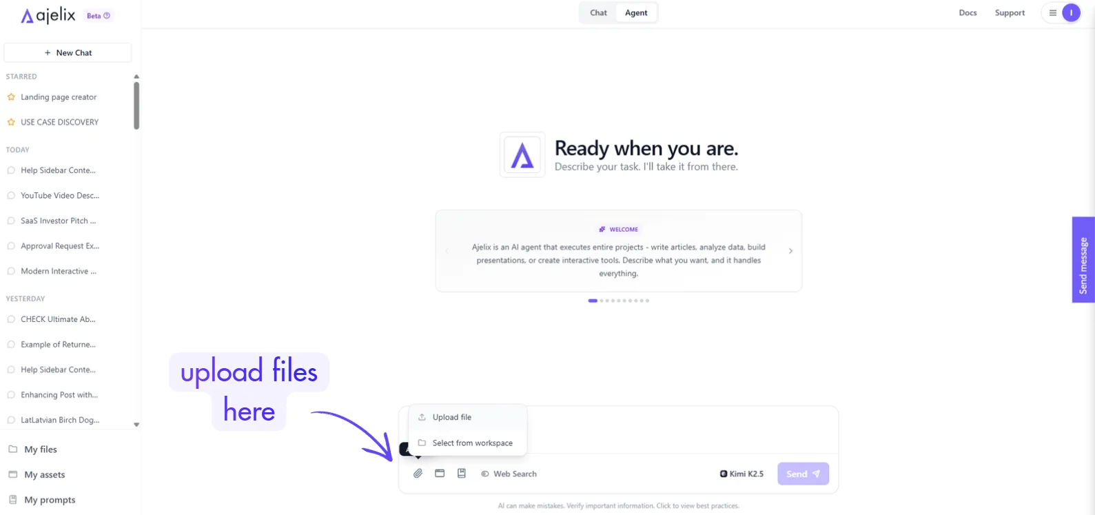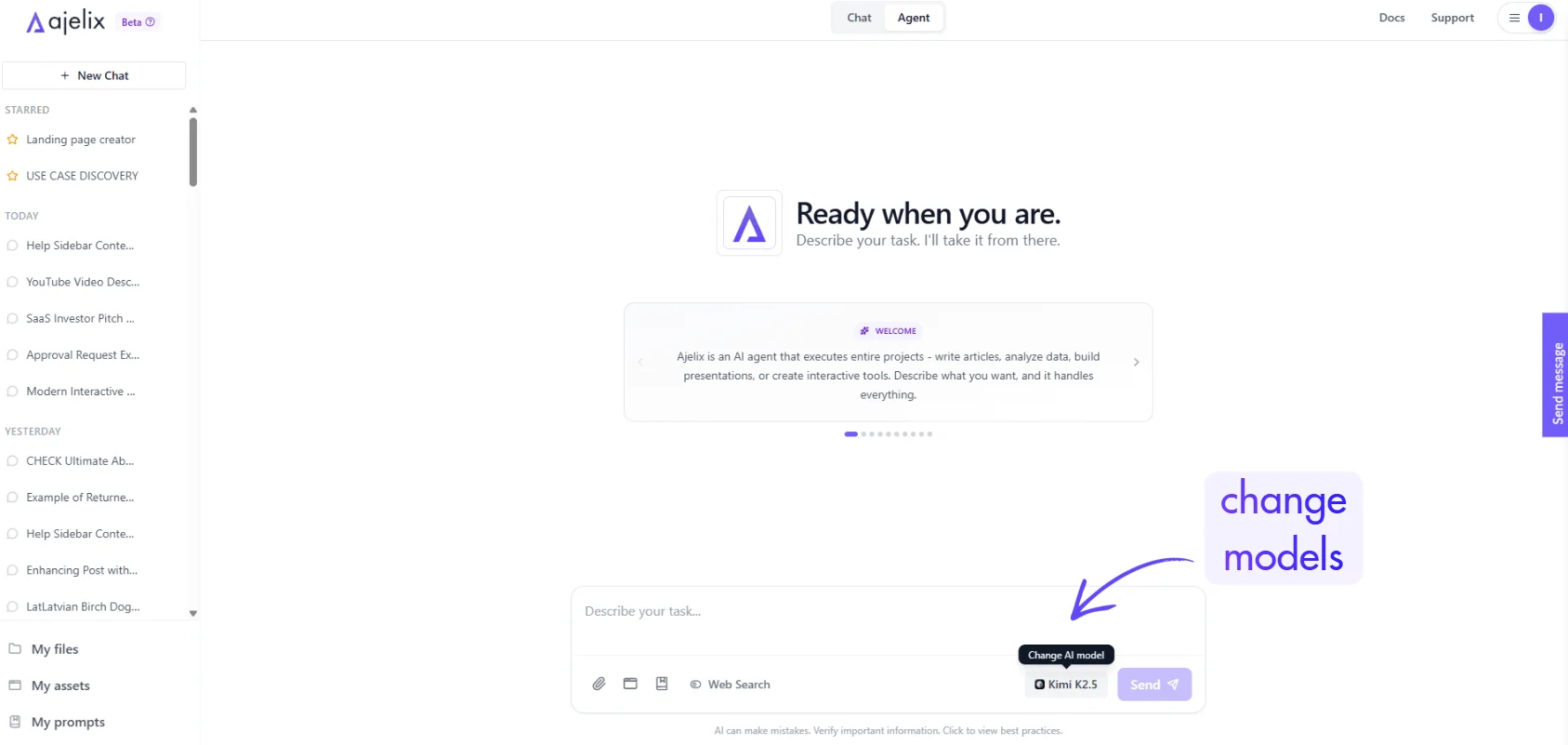 Switch modes at any time based on your task complexity. Agent mode is recommended when working with files, creating assets, or performing multi-step operations.