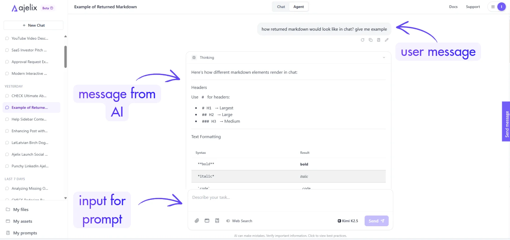 The main chat interface is your central workspace for interacting with Ajelix AI. Messages appear in a conversational thread with clear visual distinction between user inputs and AI responses.