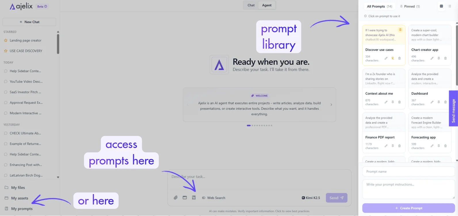 The prompt library contains your saved prompts for common tasks. Access it via the book/document icon near the input field.