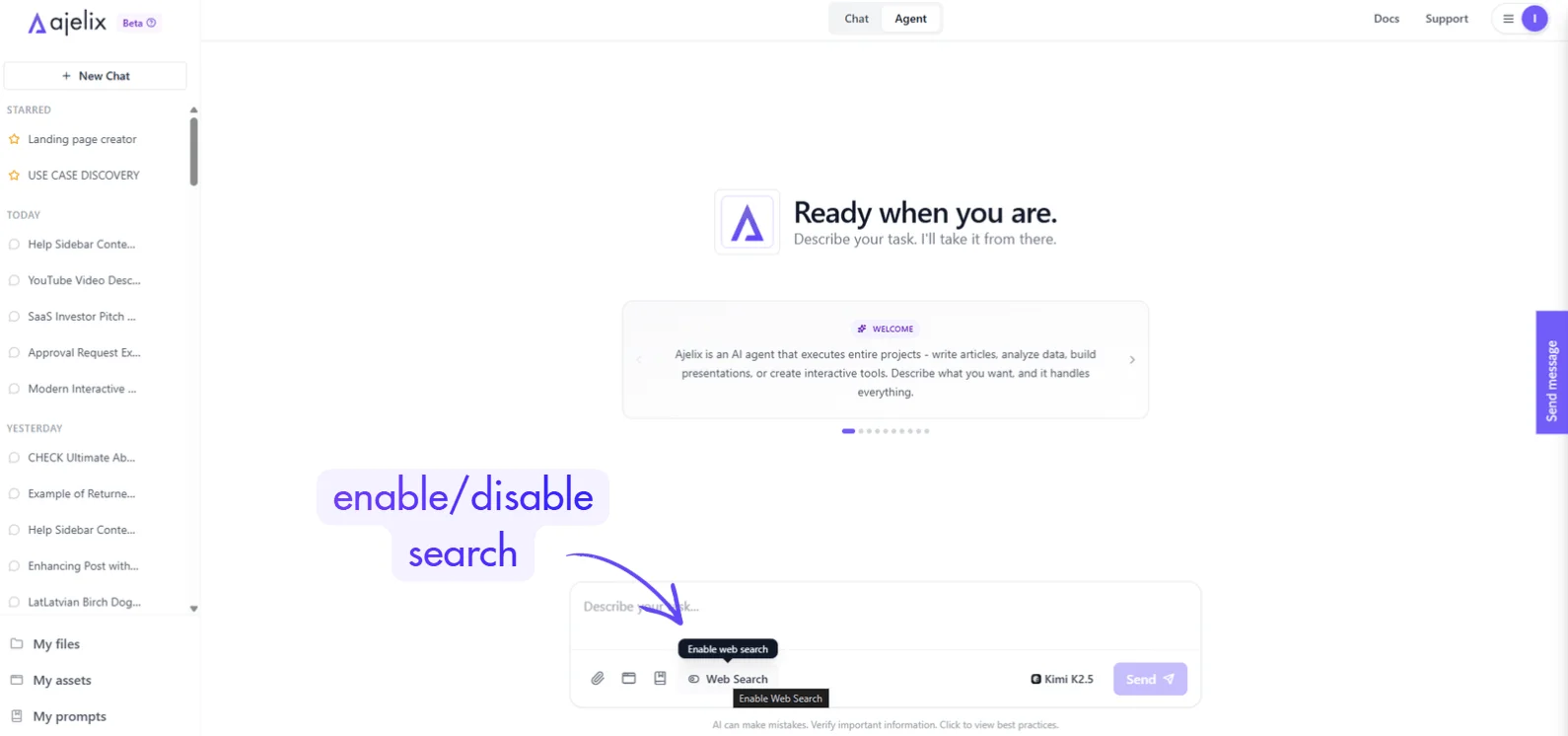 Enable internet access for real-time information by toggling the Web Search switch, located in the toolbar below the input area.