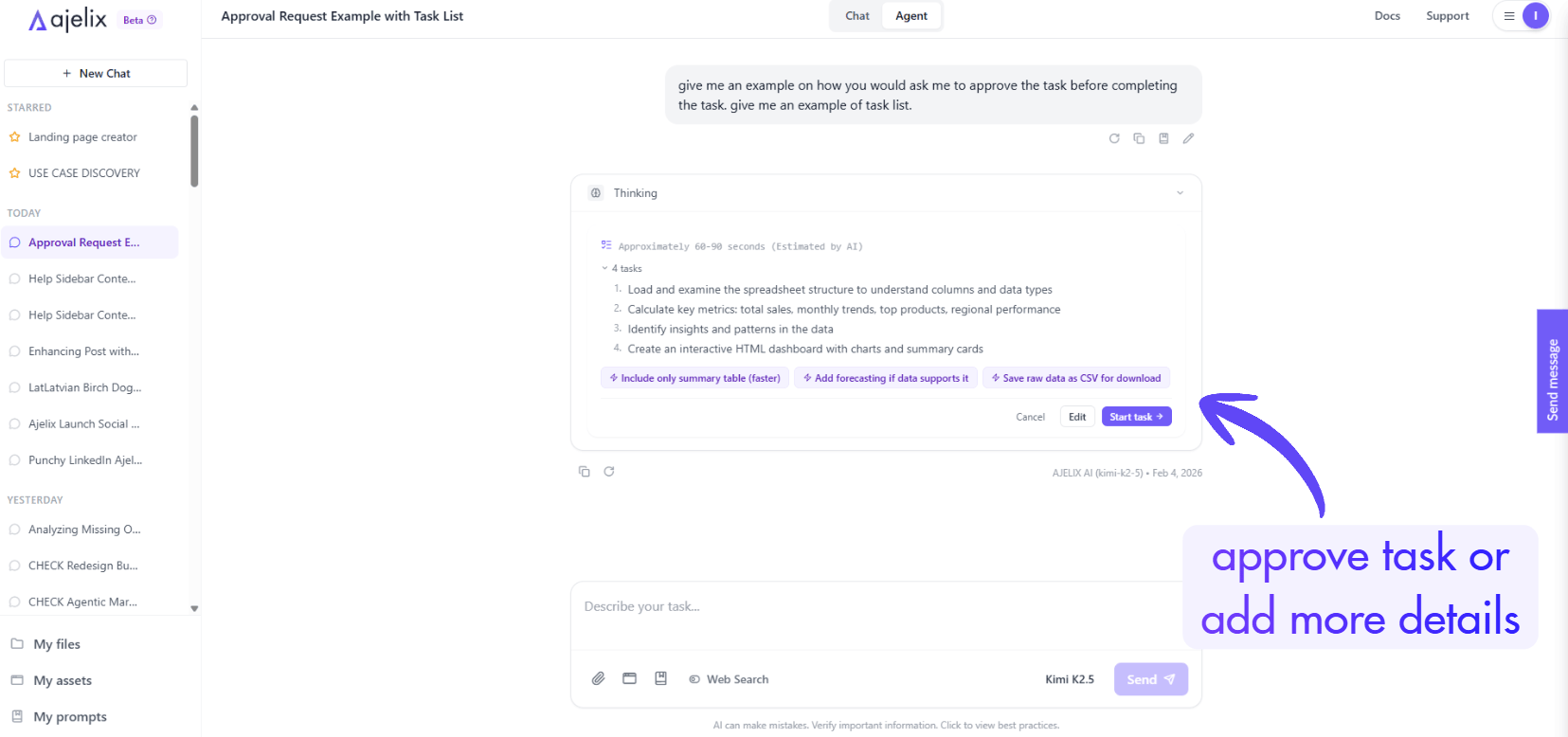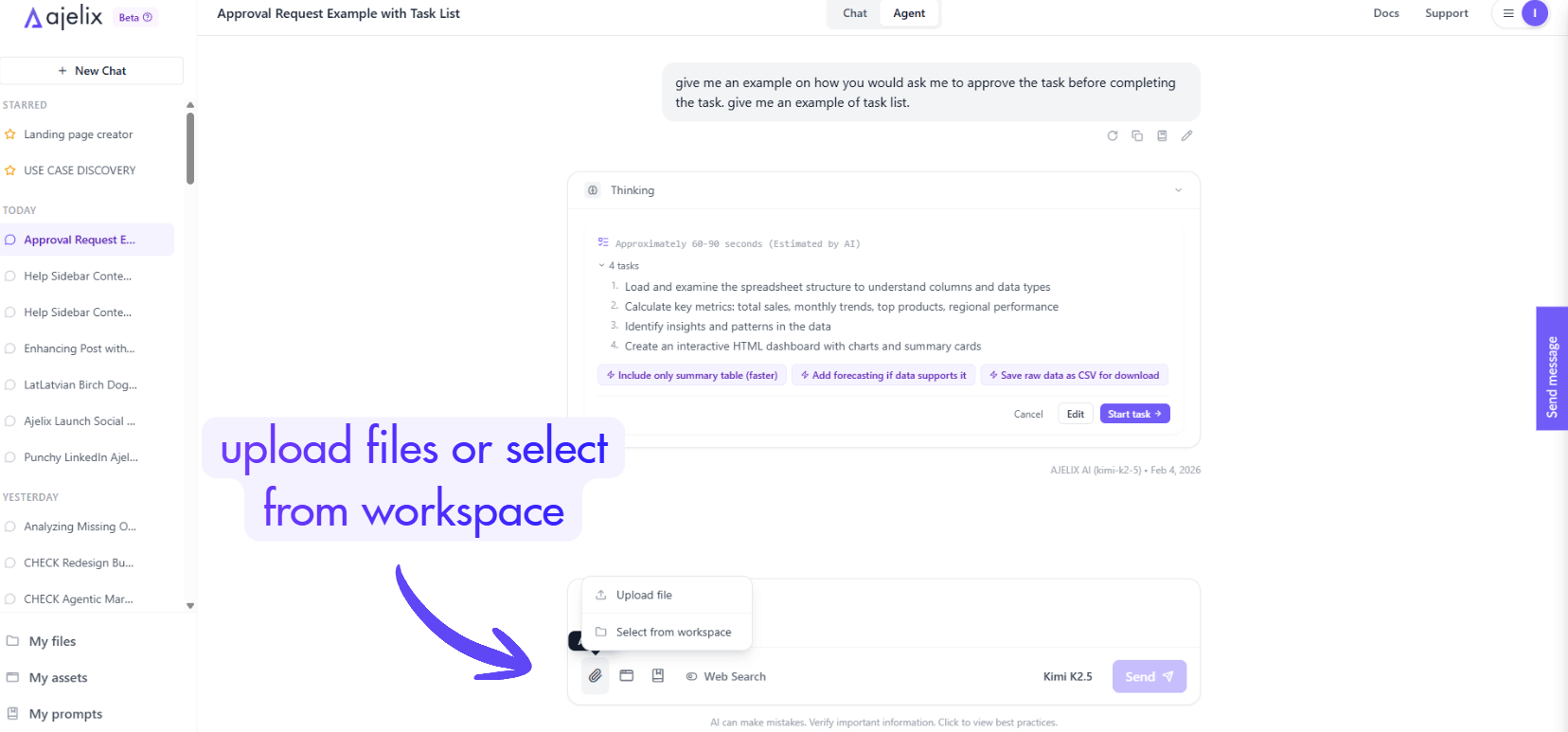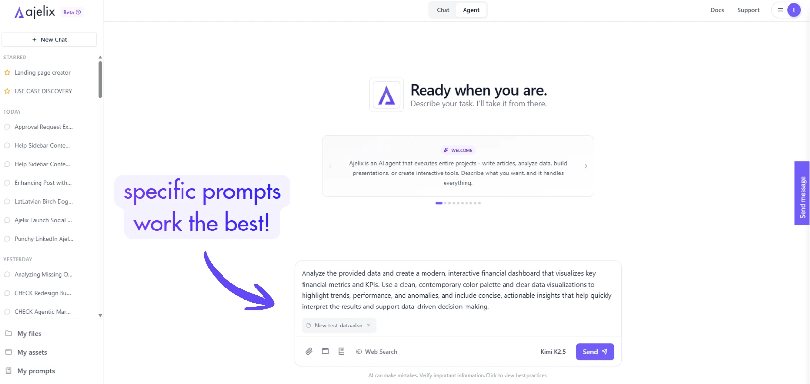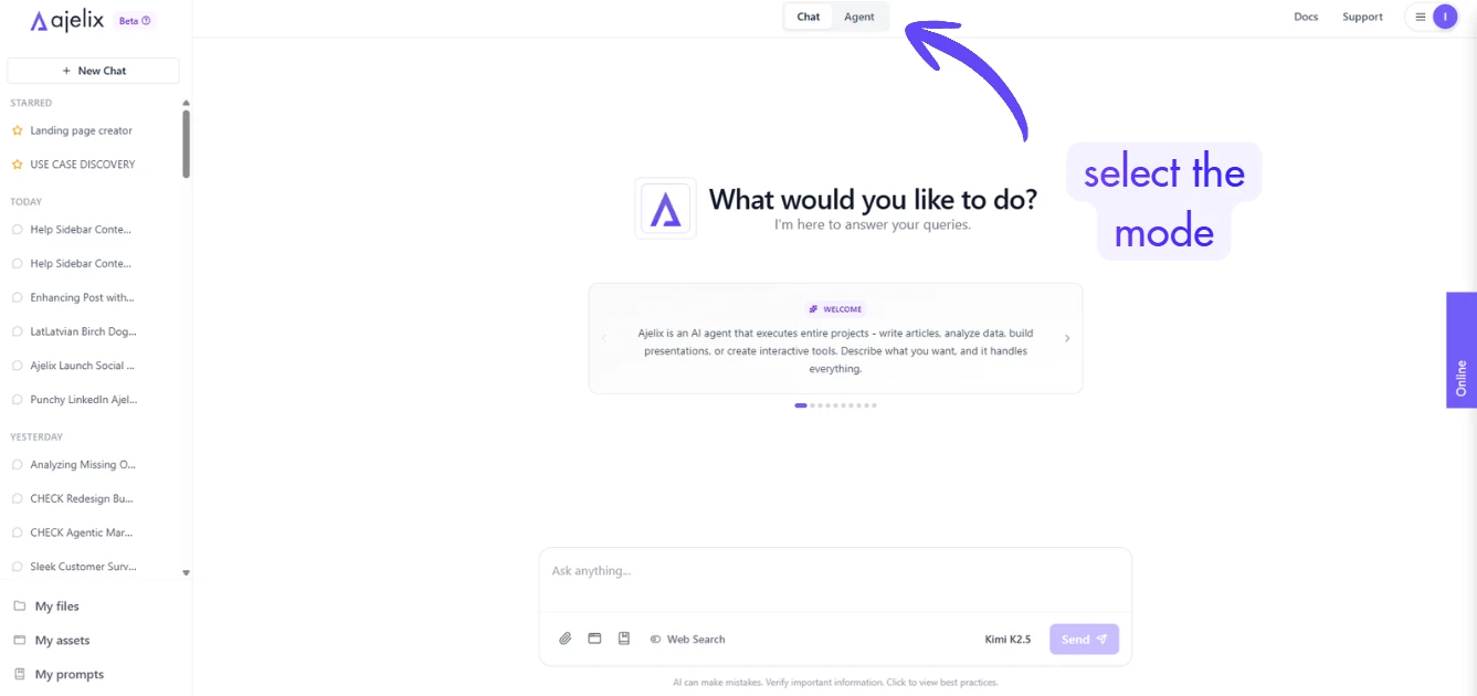 Start by typing a request in the chat input. Ajelix handles two modes: